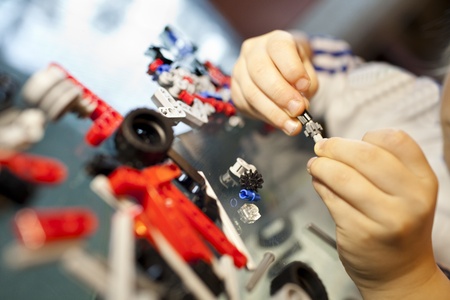 children's hand collecting details from the construction set at a glass table