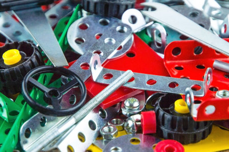 children's set of metal designer for modeling, nuts, bolts, tools, close. as background, front view