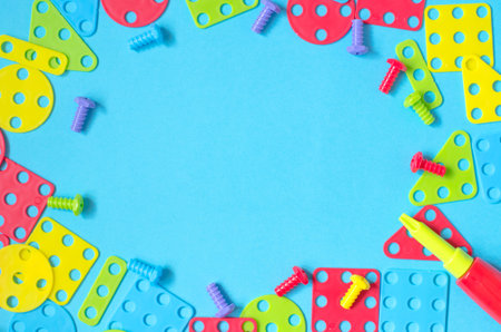 Elements of children's multicolored constructor on a blue background with a place for text