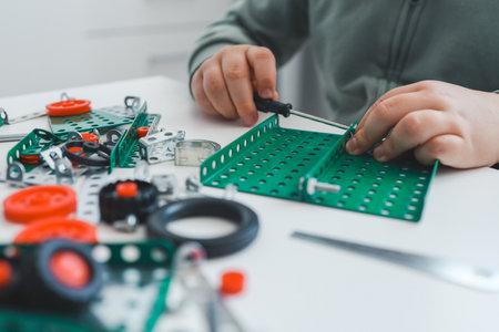Close up of unrecognizable boy building electric car in robotics and engineering class at school, copy space