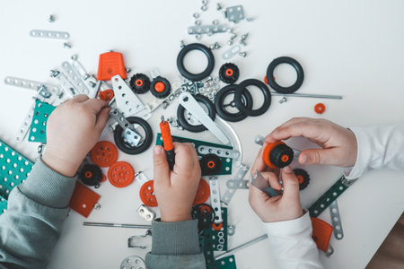 Children play with a metal constructor, top view hands.