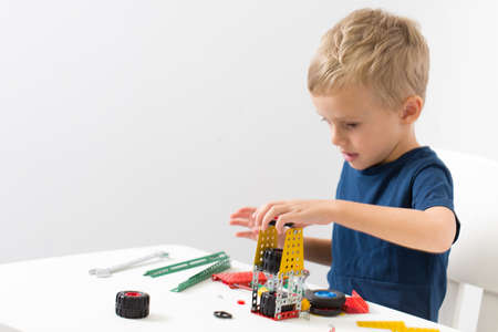 Smiling kid child constructor checking technical toy. Children Robotics constructor assemble robot