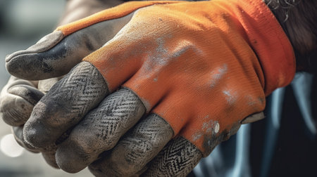 Close-up of one glove with orange rubber gripping a metal tool on a rough surface, representing strength and durability