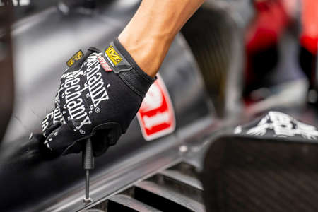 Crew members of AJFoyt Racing prepare their race car before a practice for the Sonsio Grand Prix at Road America in Plymouth, WI, USA.