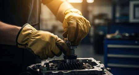Close up of a mechanic gloved hands working on an engine part with a gear in a workshop. Focus on automotive repair and maintenance.