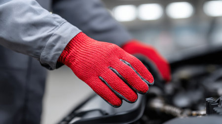 A focused view of a hand wearing a red protective glove, resting on a car engine. The image captures the essence of automotive maintenance in a workshop setting, showcasing safety and precision.