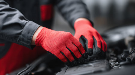 An automotive technician wearing bright red gloves inspects engine components in a repair shop, highlighting the importance of safety and attention to detail in vehicle maintenance.