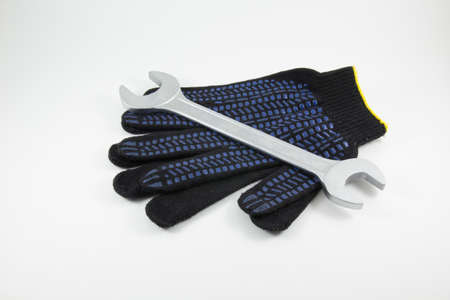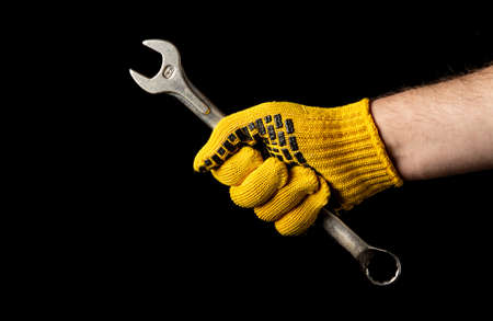 hands wearing gloves holding ring wrench, happy labor day. International celebration.
