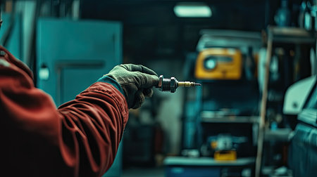 A close-up view of a hand in a red jacket holding a spark plug, set in an industrial workshop filled with various tools and equipment.
