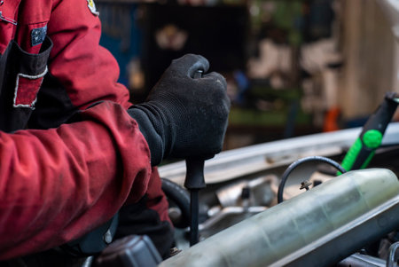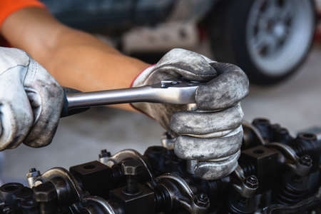 Hand of car mechanic adjusting an engine with socket wrench, Automotive repair service in workshop