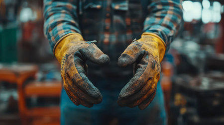 A worker stands with dirty, worn gloves, showing the signs of hard labor in a bustling workshop filled with tools and machinery. The gritty environment highlights a day of industrious work.