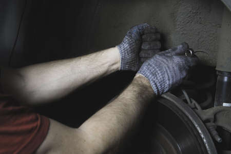 A mechanic in the service center checks the suspension of the car. Performs seasonal wheel replacement.