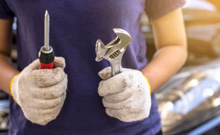 Closeup of hand mechanic engineer fixing. Car technician holding the screwdriver and spanner, concept car maintenance