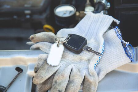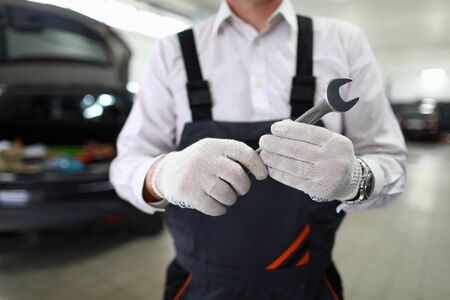Focus on automechanic male hand in white gloves holding and showing utility for fixing car at camera. Machinery checkup and service station concept. Blurred background