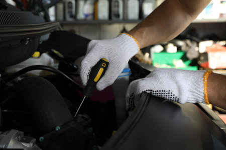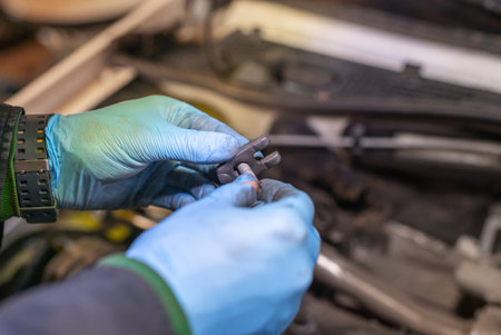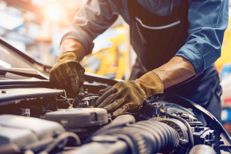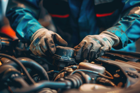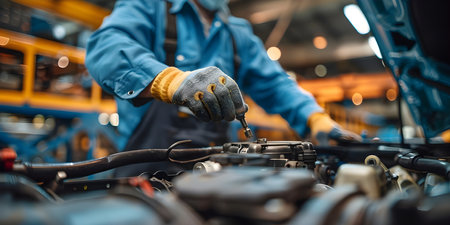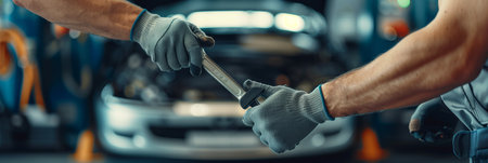 Expert mechanic s skilled hands working on car repair in professional auto service center