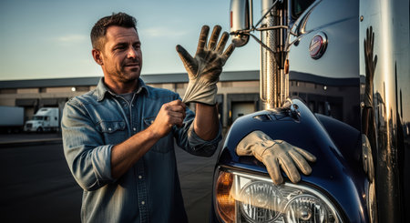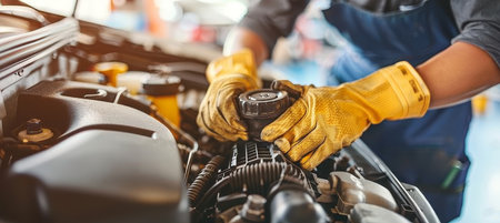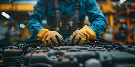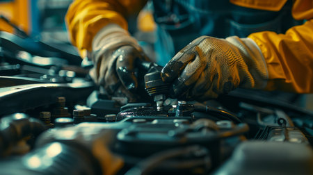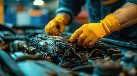 A skilled mechanic works diligently under the hood of an auto, wearing bright yellow gloves, with focus on intricate engine repairs in a professional
