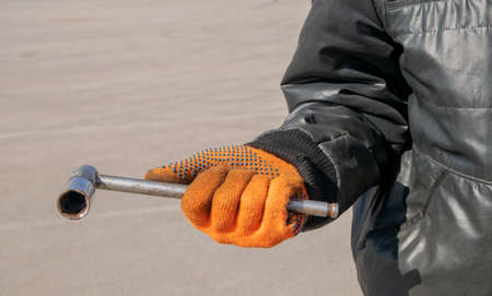 Metal wheel wrench in the hands of a man wearing orange gloves and a black twist