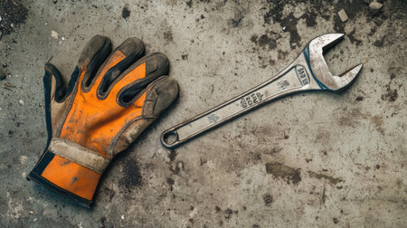 A single glove with orange rubber side lying beside a wrench on a dusty floor, suggesting hard labor and maintenance work