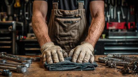 Mechanic Cleaning Tools with Organized Tool Chest in Workshop