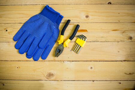 Gloves, hammer and wrench on old metal background, top view, closeup.