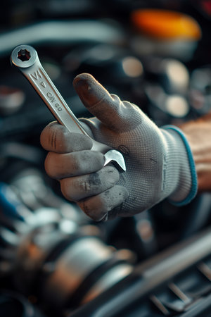 Closeup of a mechanic's hand confidently holding a wrench in a car repair shop.