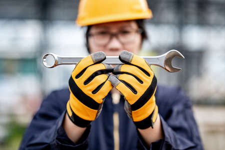 Male mechanic hand holding combination wrench at work. Maintenance worker wearing protective suit and safety helmet choosing equipment for mechanical engineering project.
