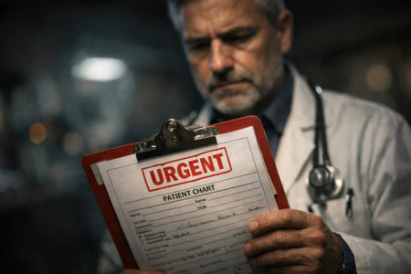A doctor holds an urgent patient chart in a hospital. He focuses on the information to prepare for immediate action.