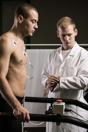 Shot of a patient on a treadmill during his check up and doctor supervising the examination