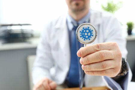 Close-up of stethoscope detail and germ. Doctor in white uniform. Microbe and virus spread. Handover of infection. Luxury clinic office. Modern medicine concept