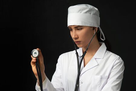Portrait of a female doctor with makeup in a white coat with a phonendoscope in her hand