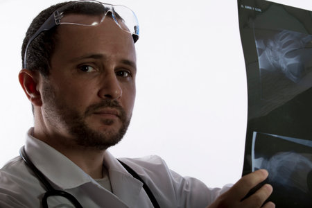 Doctor holding and watching x-ray on the table.