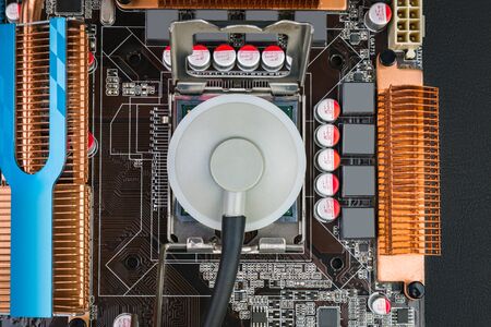 Listening to the processor with a stethoscope on an old motherboard to fix a broken computer on a black desk. Flat lay.