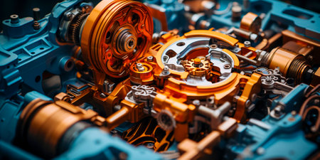 This image captures the intricate details of a mechanical component used in automotive engineering, showcasing vibrant colors and precision craftsmanship.