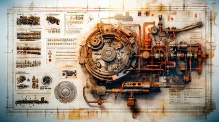 Illustrative photography of industrial machinery with technical plans on a gradient background