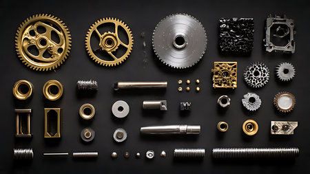 Assorted mechanical parts and gears neatly arranged on a dark background