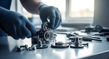 Gloved hands are shown assembling metal gears on a workbench. The scene is illuminated by window light. Gears, bolts, and shafts are scattered on the surface.