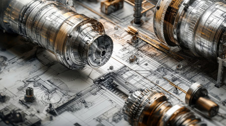 A detailed arrangement of mechanical components on top of a technical drawing. The image showcases precision engineering with various gears, bolts, and parts, ideal for industrial design themes.