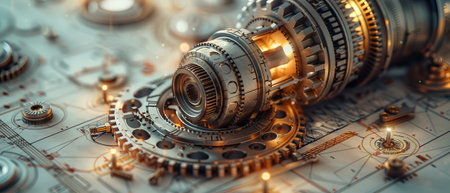Mechanical parts close-up An intricate close-up of interlocking gears and cogs in motion, their polished metallic surfaces gleaming under soft golden light. Every