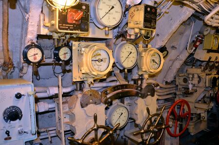 Cherbourg-Octeville, France - May 22, 2017: Detailed view of control devices inside of the Nuclear submarine Le Redoutable of French Navy in the