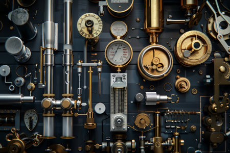 Vintage industrial control panel with brass gauges and valves. That the image is generated using AI.