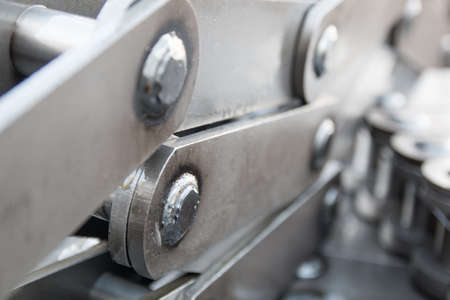 Pulling block conveyor chain close-up. Technology of mechanical engineering.
