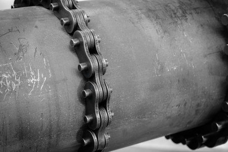 Strand roller chain going around sprockets on industrial machine. industrial engineering technology concept background