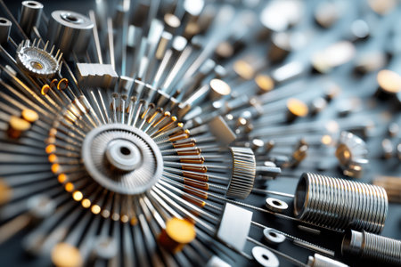 A visually striking collection of precision metal components and parts arranged methodically on a clean surface, ideal for industrial projects and designs.