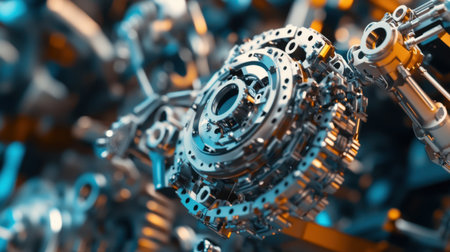 Intricate mechanical gears and clockwork components are displayed shining metallic surfaces and glowing highlights exemplifying futuristic engineering artistry and design.