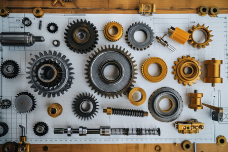 Intricate mechanical components on a blueprint showcasing engineering excellence and innovation.