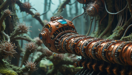 A sleek mechanical snake slithers up from cracked ground, its glowing eyes piercing the darkness, creating a futuristic feel Perfect for sci-fi and tech themes.