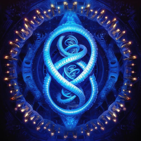 Artistic metallic DNA helix with steampunk mechanical elements and glowing orange accents. for biotechnology, genetic engineering, science, and futuristic technological concepts.