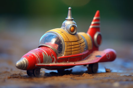 macro shot of a snail on a vintage toy rocket with a blurred background, created with generative ai