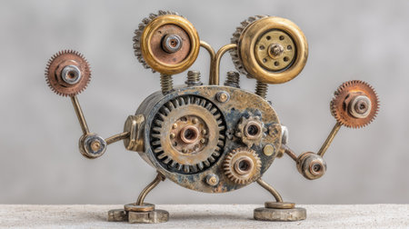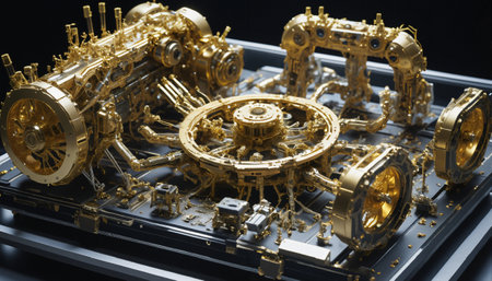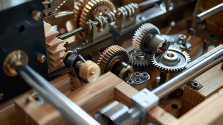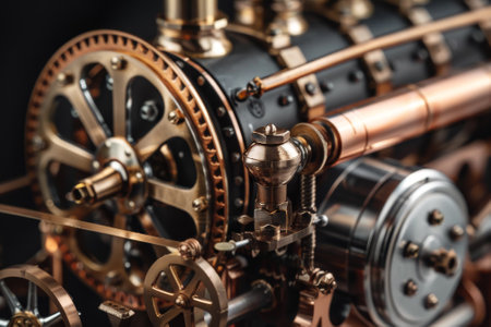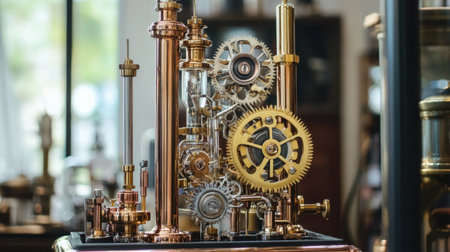 This captivating steampunk mechanism features intricate brass gears and tubes, highlighting the artistry and craftsmanship of vintage engineering in a workshop setting.