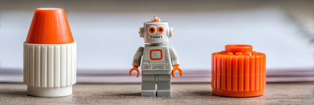 A cute robot figure stands between two orange and white objects on a wooden table, creating a playful workspace scene.